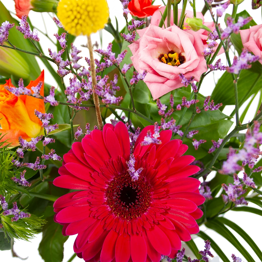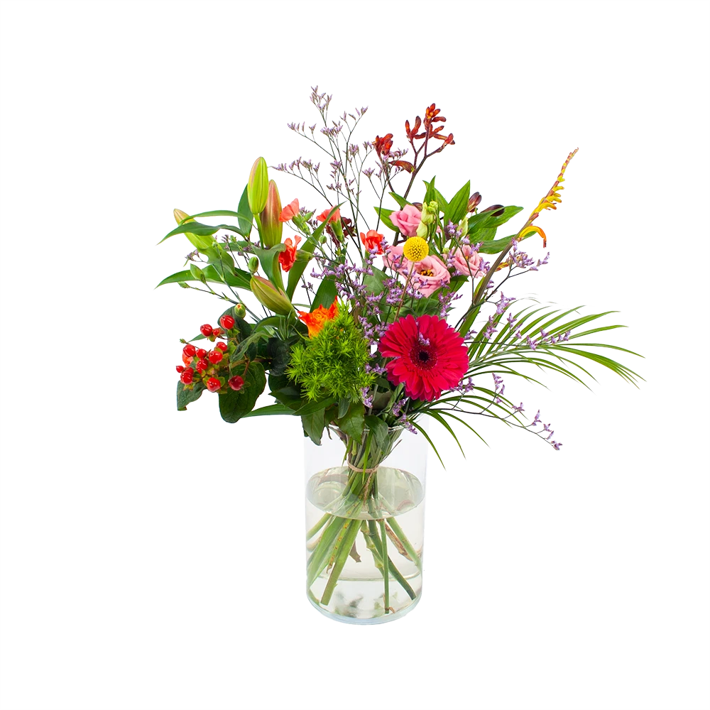 Met Boeket Kleurrijk geplukt breng je de gezelligheid in huis! Geniet van de verste en mooiste bloemen en fleur je huis op! Altijd vers van de kweker! Verwen jezelf of verras iemand anders met een prachtig boeket. *Exclusief accessoires en vaas.