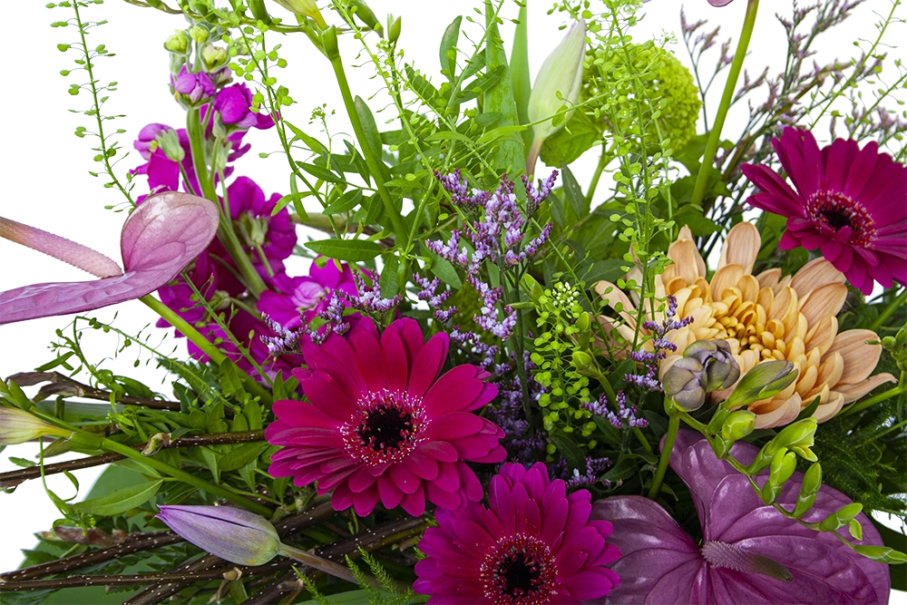 De combinatie van de kleurrijke paarse bloemen geven het bladboeket een prachtige en chique uitstaling. Dit bladboeket creëert een gezellige sfeer in elke ruimte. Bovendien geschikt voor verschillende gelegenheden. Feliciteer, bedankt of verstuur zomaar dit prachtige handgebonden boeket en verras de ontvanger! * Exclusief accessoires en vaas
